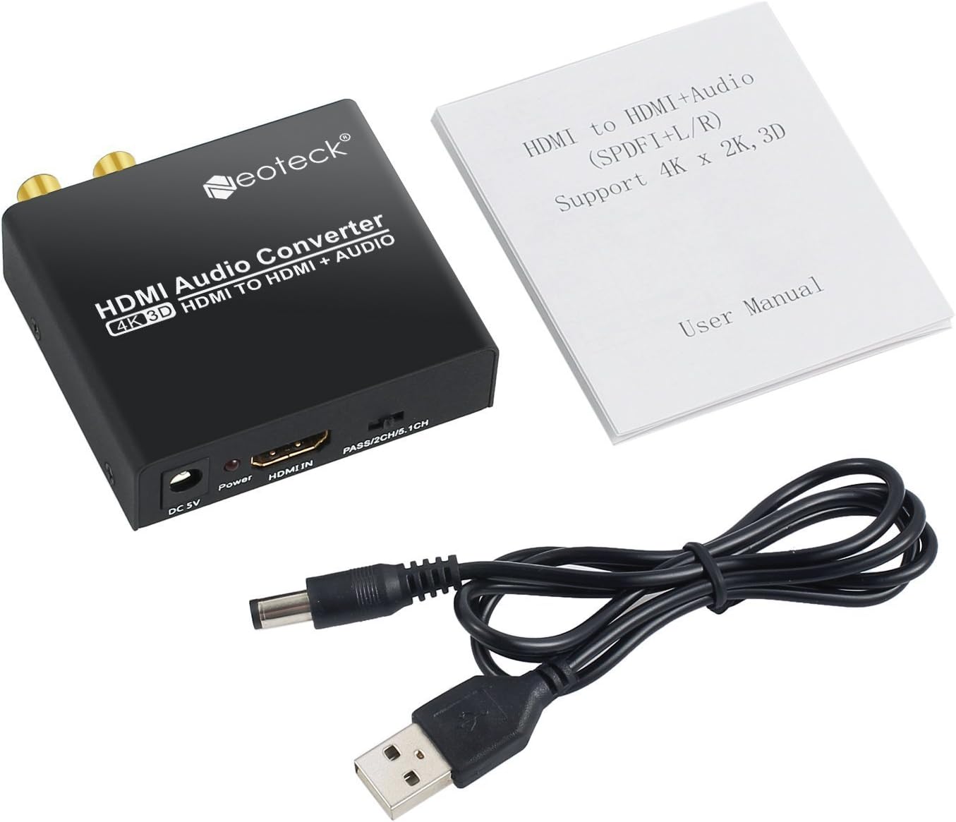 Image: Neoteck DAC04 HDMI Audio Extractor, USB power cable, and user manual included in the package.