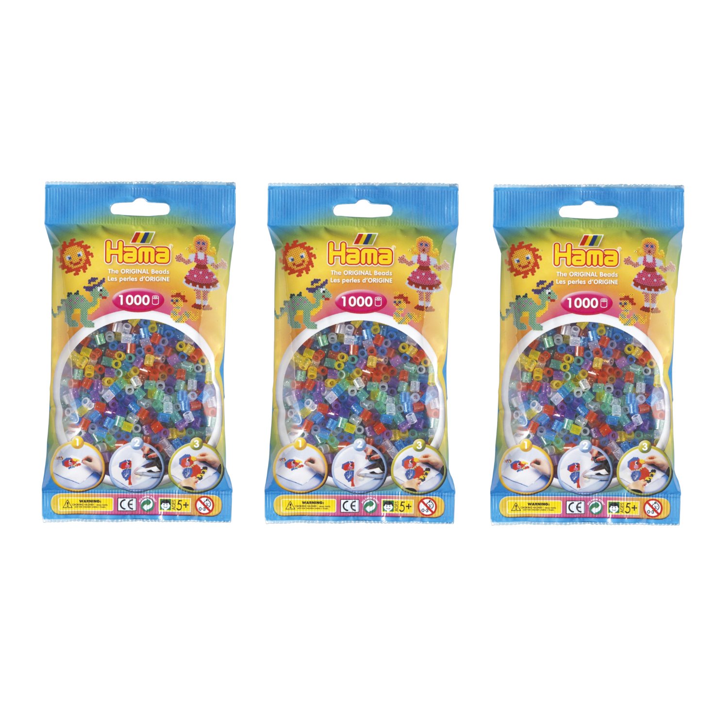 The Hama 207-54 Glitter Mix Midi Beads set provides a creative outlet for individuals aged 5 and above. This package contains 3 bags, each with 1000 midi-sized beads, totaling 3000 pieces. These beads are designed to be placed on a pegboard and then fused together with heat, creating various designs and figures. The activity promotes fine motor skills and encourages imaginative play.