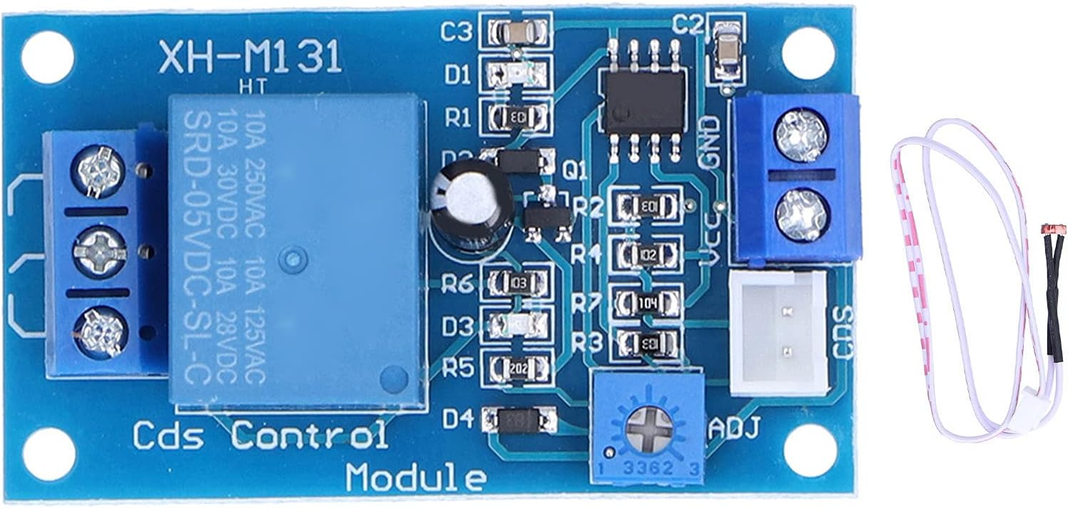 Figure 1: The Eujgoov XH-M131 Photosensitive Resistance Relay Module with its external light sensor.