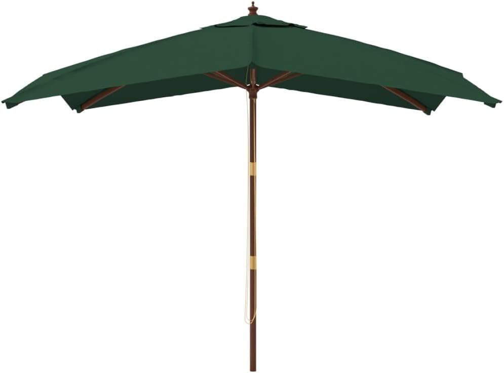 This image shows the vidaXL Garden Parasol in its fully open position, demonstrating its coverage and aesthetic in an outdoor environment. The green canopy is extended, and the wooden pole is visible.