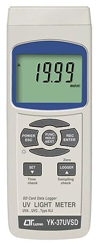 The Lutron YK-37UVSD is a professional-grade light meter designed for accurate measurement of both UVA and UVC light. This device features a microprocessor circuit for high reliability and durability, making it suitable for various applications including monitoring blue light radiation hazards, UV sterilization, graphic arts, photochemical matching, UV EPROM erasure, photoresist exposure, and curing of inks, adhesives, and coatings. It includes an SD card real-time data logger and supports Type K temperature measurements.