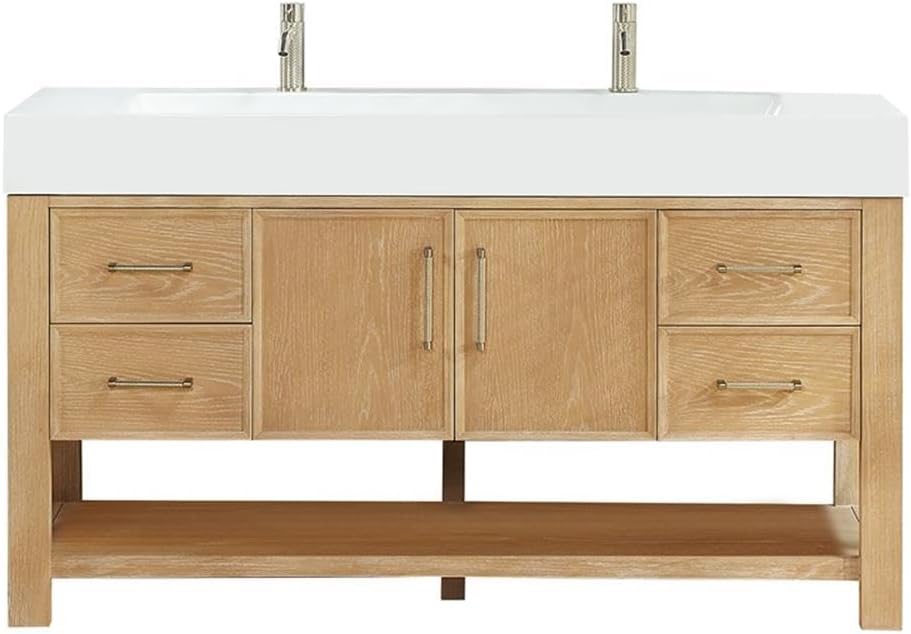 Voorkant view van de Vinnova Vera badkamerkast, pronkstukasinmet zijn dubbele spoelbakken, lichte houtafwerking en geborsteld gouden beslag.
