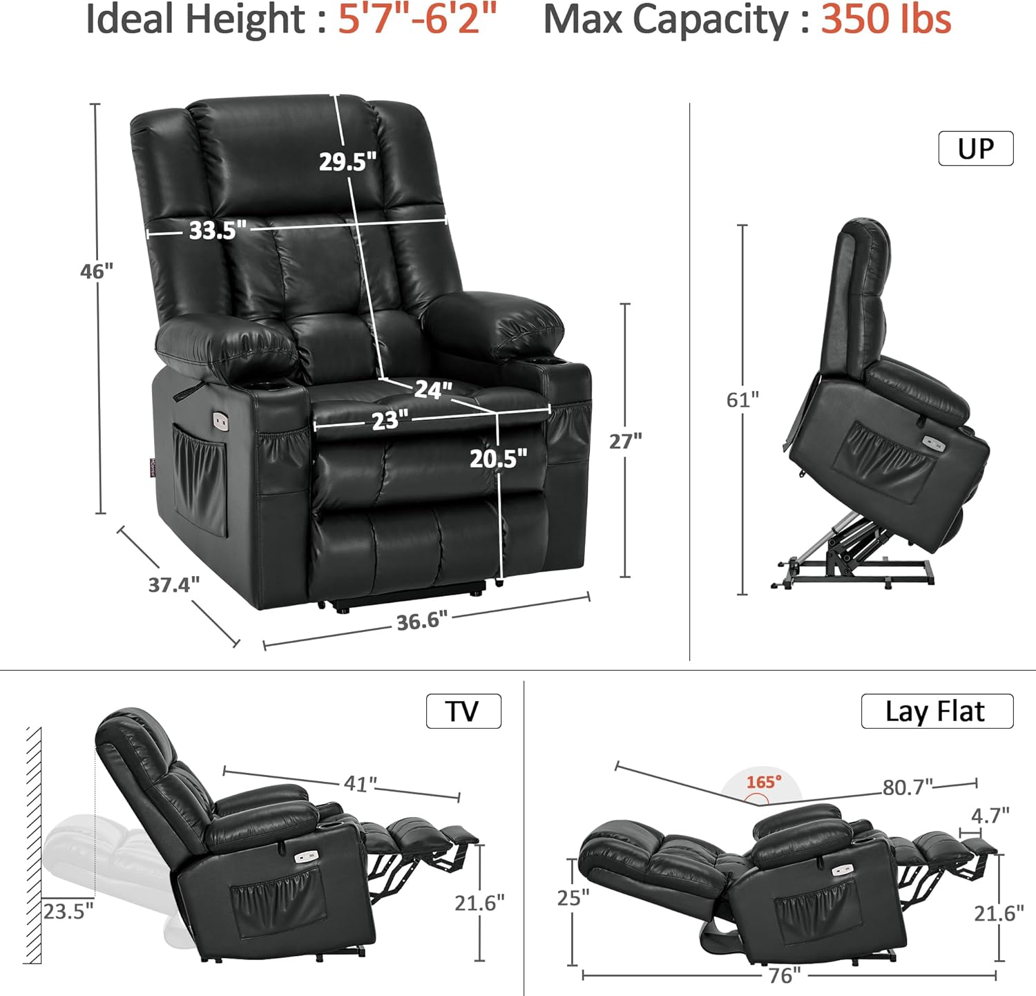 | Speciale kenmerken | Adjustable Backrest, Heated, Power Lift, Power Recliner, Zero Gravity, Dual Motor, Vibration Massage, USB & Type-C Ports, Cup Holders |